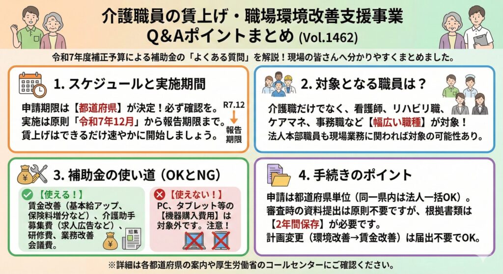 Vol.1462では、介護分野の賃上げ・職場環境改善支援事業について詳細なQ&Aが示されています。補助金は賃金改善が目的ですが、職場環境の改善にも使えることや、新規施設でも対象になることが明記されました。