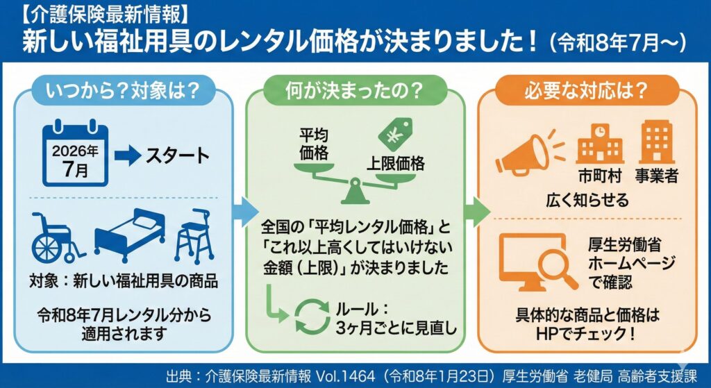 Vol.1464では、2026年7月貸与分から適用される福祉用具の全国平均貸与価格と上限価格が公表されました。価格表は3か月ごとに更新されるため、事業所は常に最新情報を確認し、利用者に適切な案内を行うことが求められます。