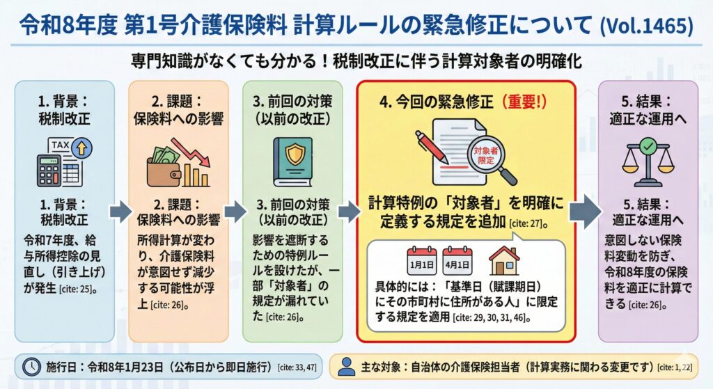 今回のVol.1465は、既存の特例に関する修正であり、介護保険制度の中身が大きく変わるわけではありません。現場での業務や利用者の手続きが増えることはなく、自治体が保険料を計算する際のルールが少し整理されたという認識で問題ありません。
